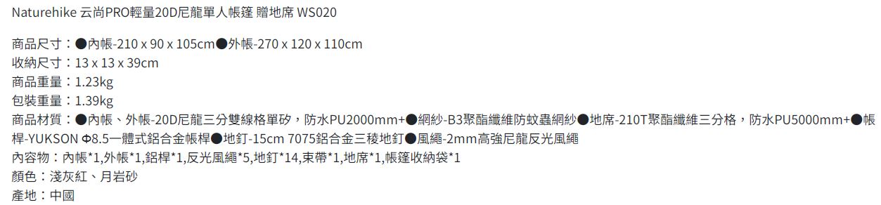 外帳材質:20D尼龍(矽膠塗層),防水係數2000mm