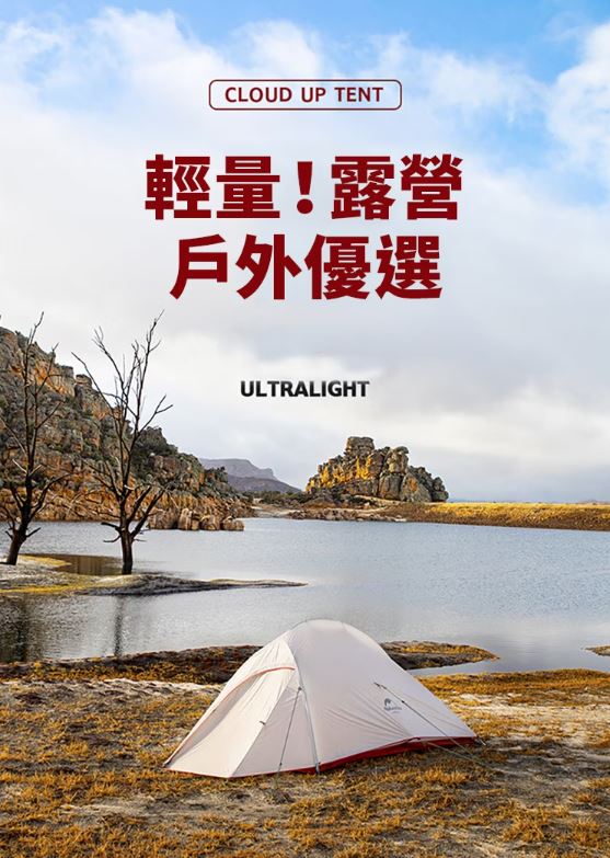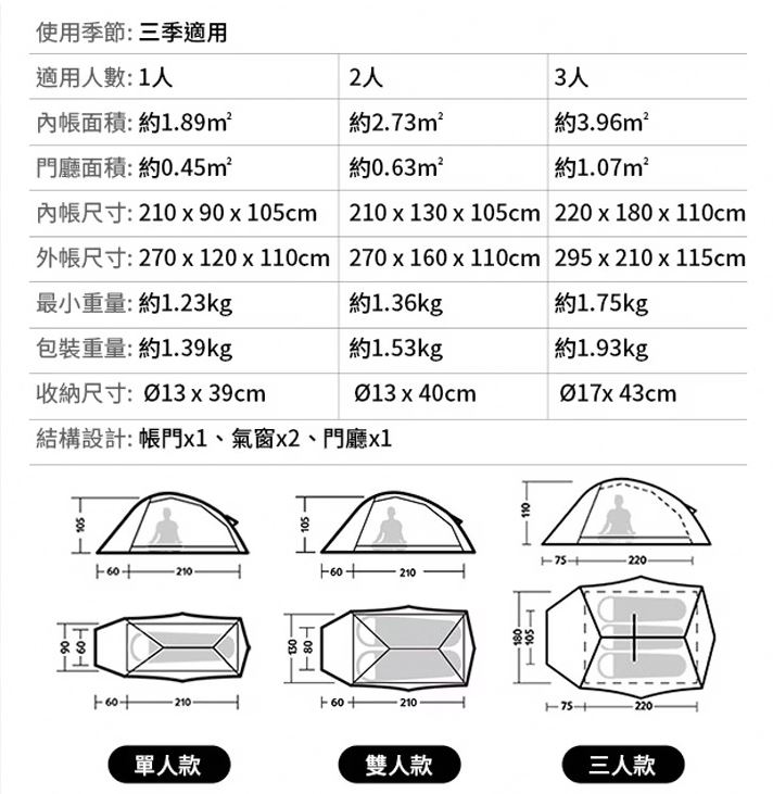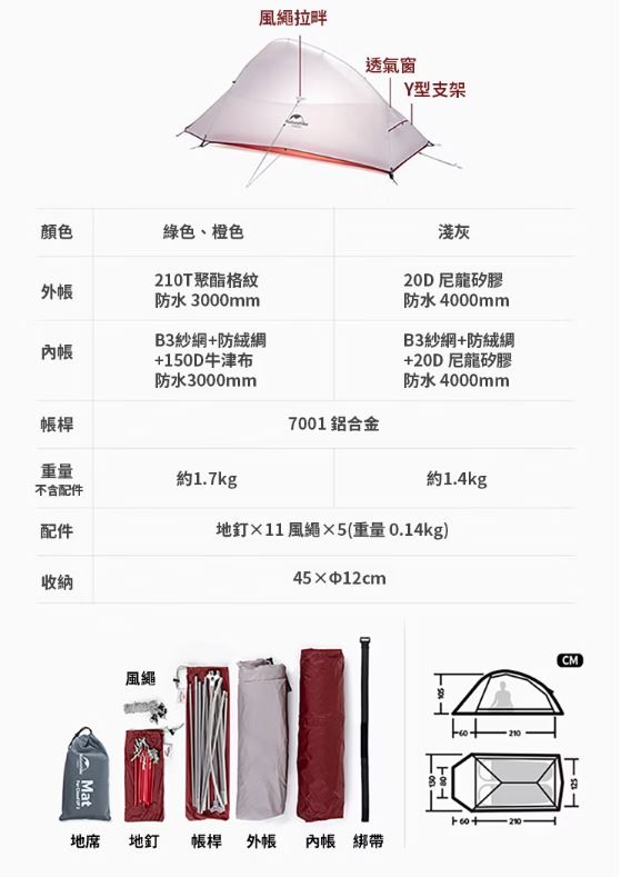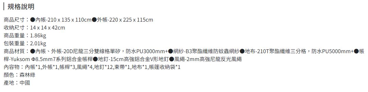 配件:外帳*1、內帳*1、7001鋁合金帳桿*2、17cm地釘*15、2.5m風繩*6、束帶*1、收納袋*1